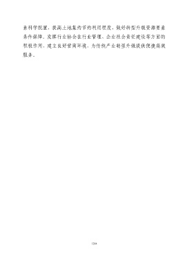 素科学配置,提高土地集约节约利用程度,做好转型升级资源要素 条件保障。发挥行业协会在行业管理、企业社会责任建设等方面的 积极作用,建立良好营商环境,为传统产业转型升级提供便捷高效 服务。 1214