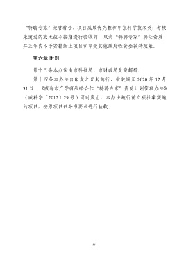 “特聘专家”荣誉称号,项目成果优先推荐申报科学技术奖;考核 未通过的或无故不按期进行验收的,取消“特聘专家”聘任资质, 并三年内不予安排新上项目和享受其他政府性资金扶持政策。 第六章 附则 第十三条本办法由市科技局、市财政局负责解释。 第十四条本办法自印发之日起施行,有效期至 2020 年 12 月 31 日。《威海市产学研战略合作“特聘专家”资助计划管理办法》 (威科字〔2012〕29 号)同时废止。本办法施行前立项批准实施 的项目,按原项目任务书要求进行验收。 564